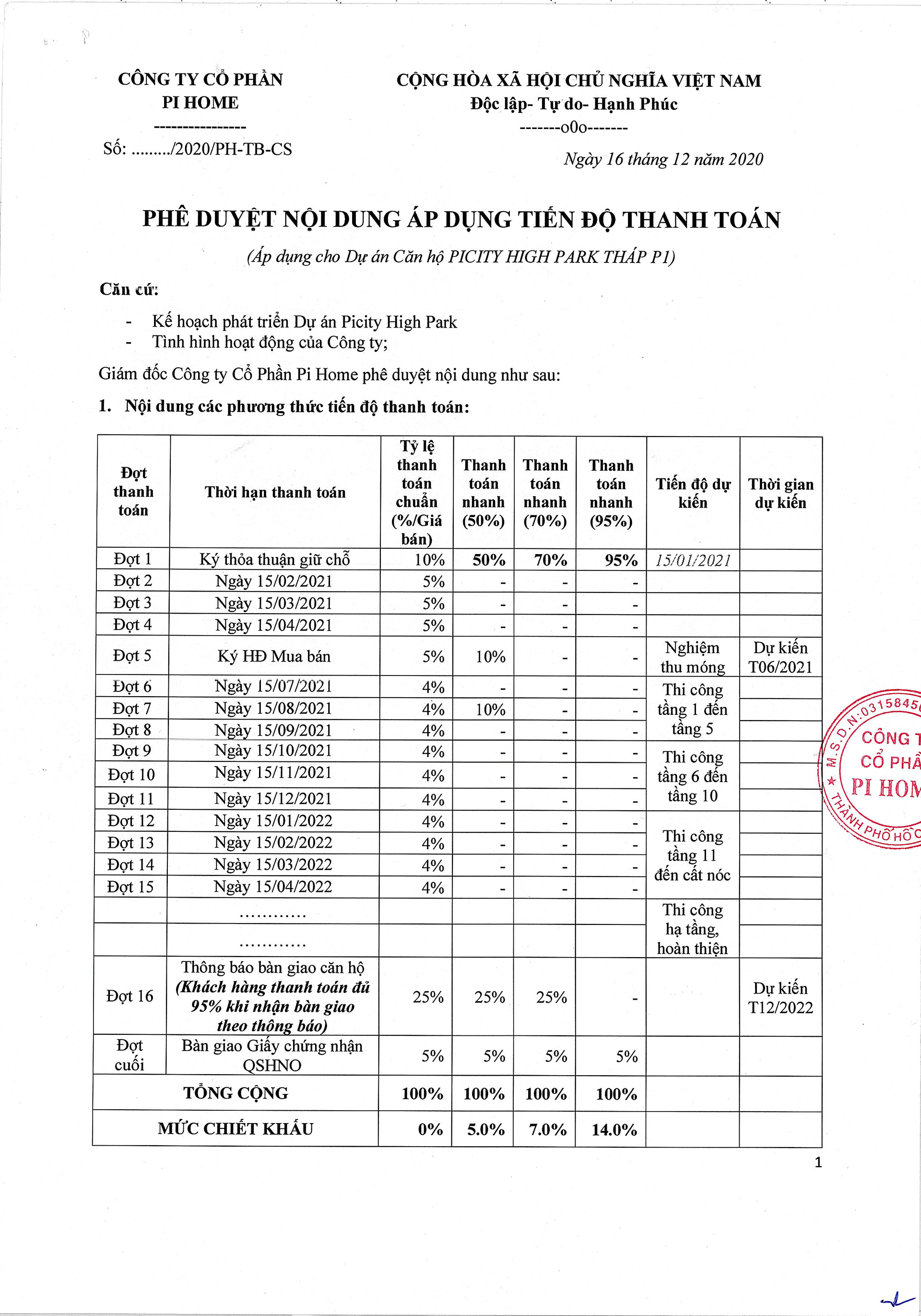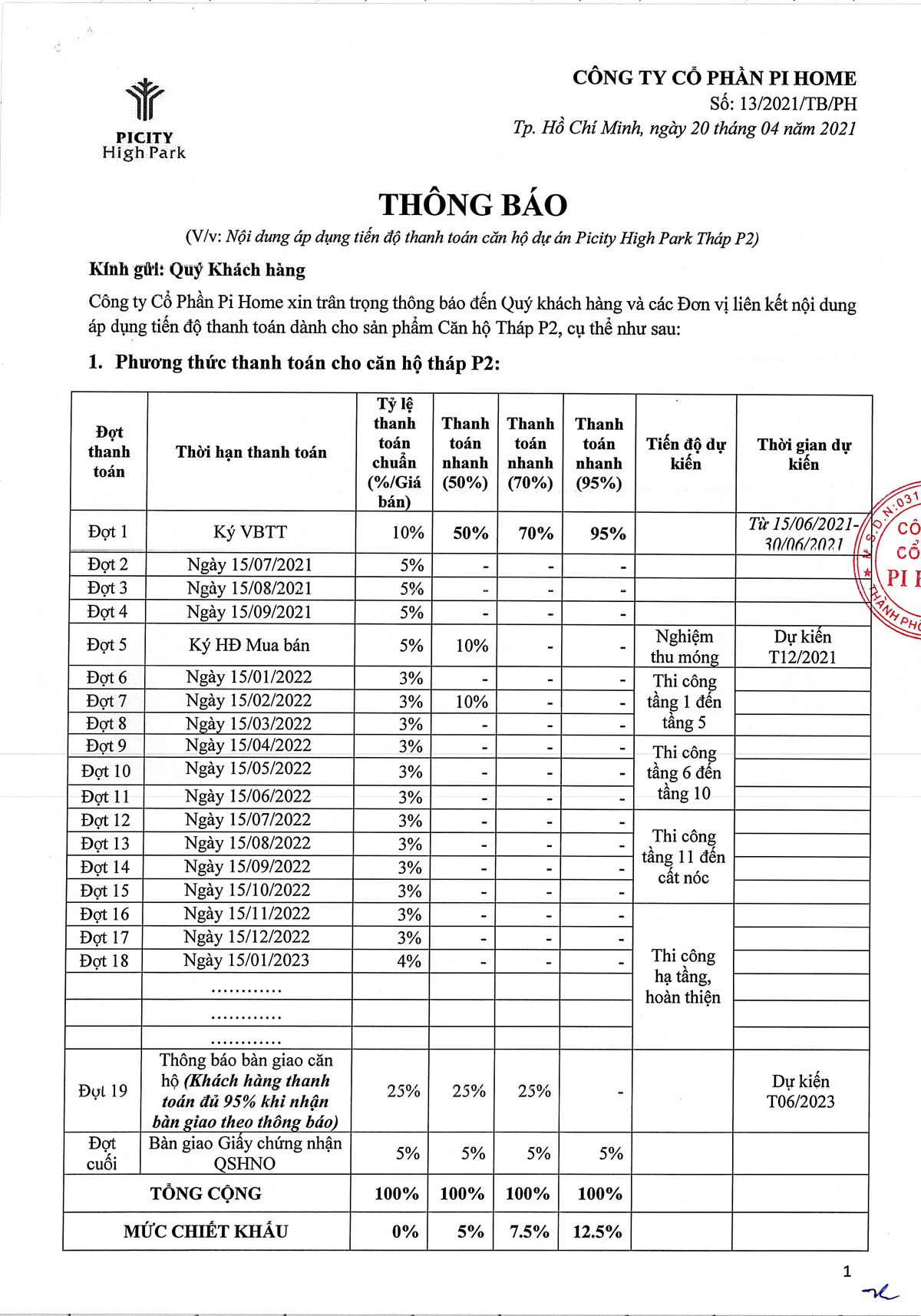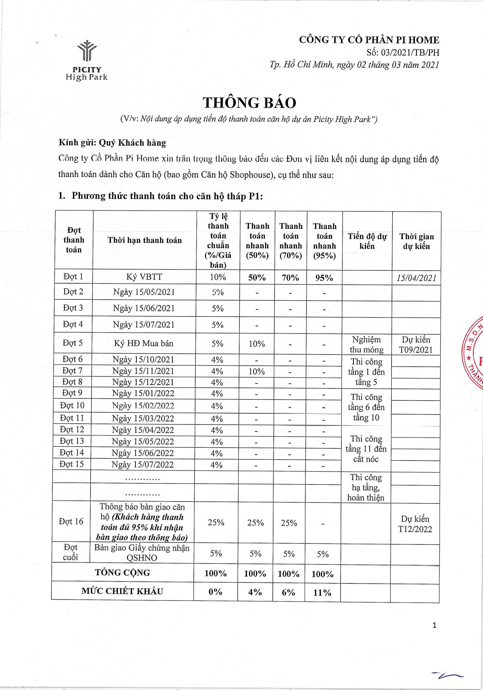 | 2 | Ký HĐMB | 10% | T4/2021 | |